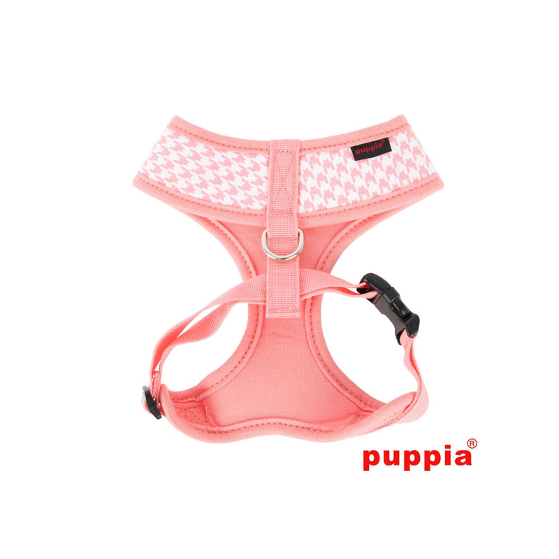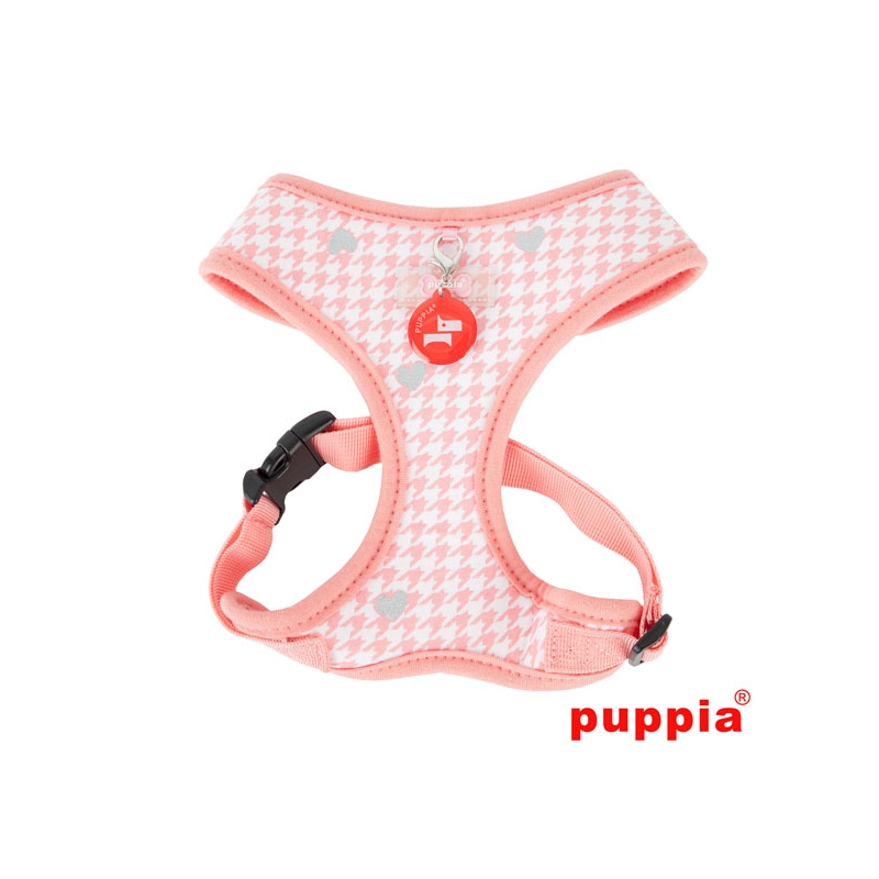 Es un arnés para perro de algodón natural , de la firma Puppia. Tiene un estampado en tonos rosa y blanco con corazones alrededor en color gris purpurina. Dispone de una cinta ajustable alrededor del pecho de tu mascota para adaptarlo al tamaño perfecto y conseguir una mayor seguridad. Cómodo y seguro para los largos paseos!