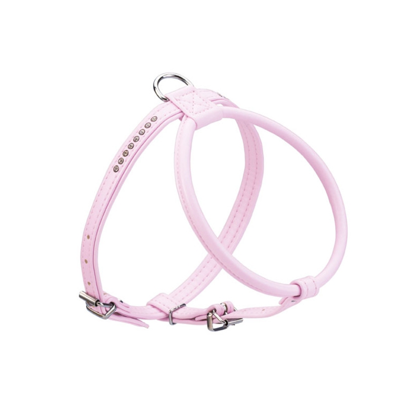 Es un arnés confeccionado en cuero artificial de color rosa. Con almohadilla de nylon fuerte y resistente. Decorado con brillantes SWAROVSKI ELEMENTS. Ideal para lucir bien guapo a tu perro en los paseos. Disponible en cuatro medidas.