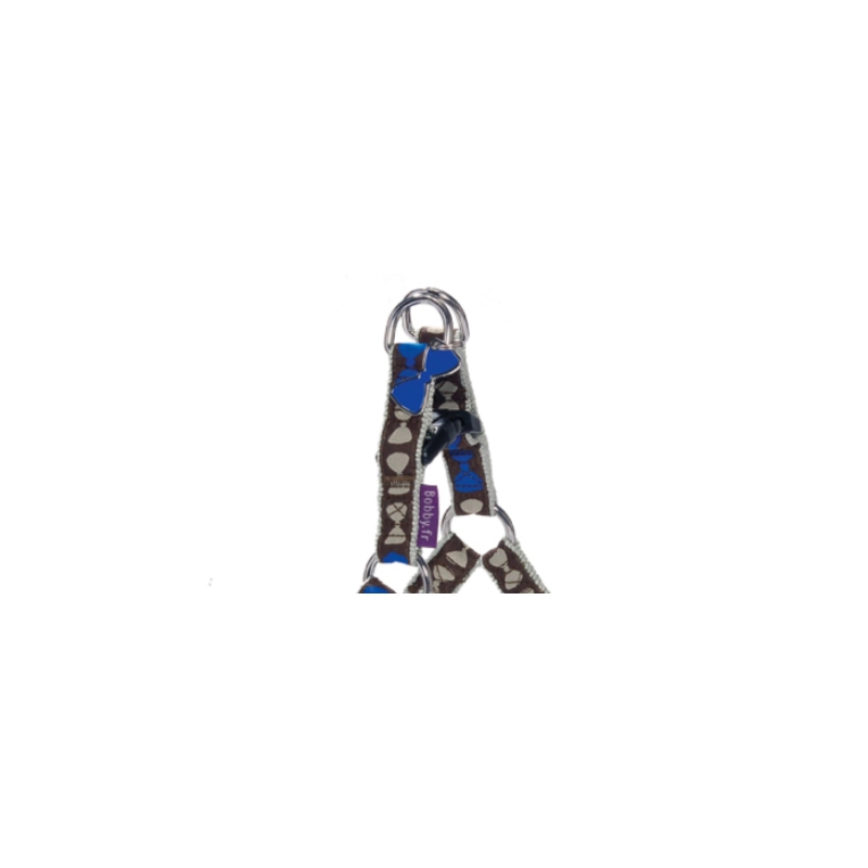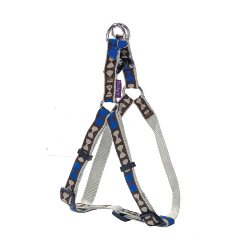 Es un resistente arnés para perro fabricado en nylon. Tiene como estampado dibujos de pajaritas en color azul y negro, con un colgante incorporado en forma de pajarita. Es un complemente muy cómodo para tu perrito y muy fácil de poner.