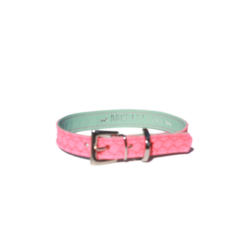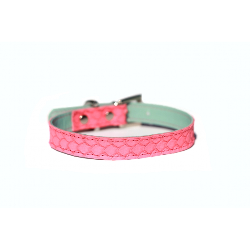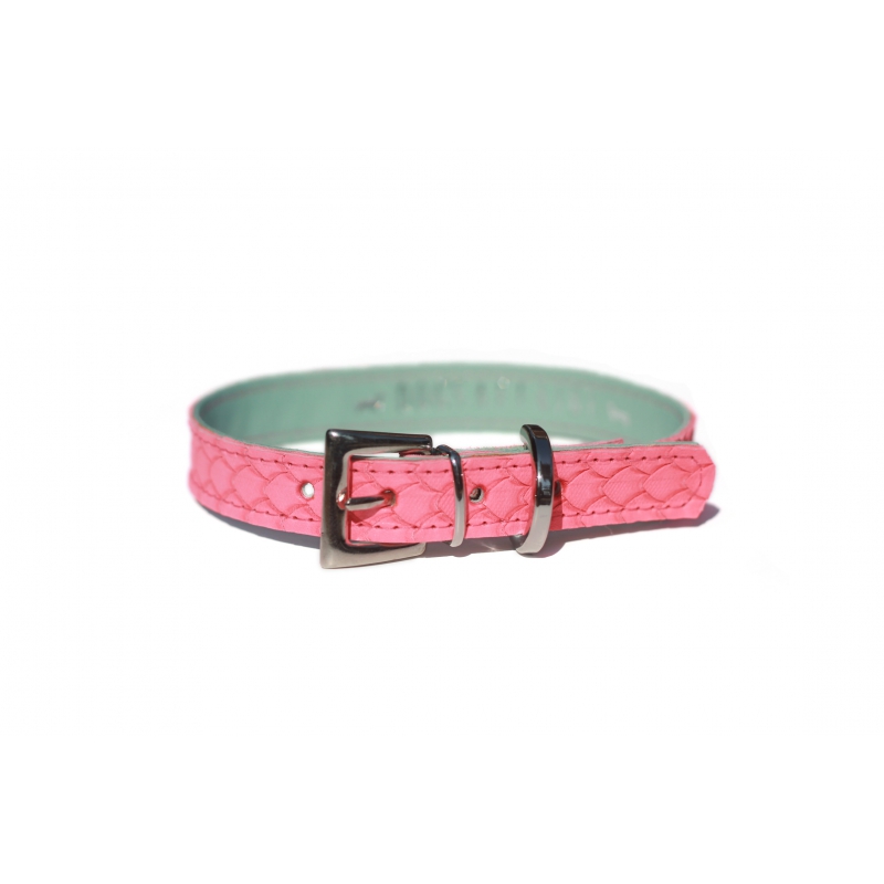Collar para perro fabricado en piel de alta calidad de color rosa con forro azul cielo. Efecto piel escamada de color rosa, suave y resistente.