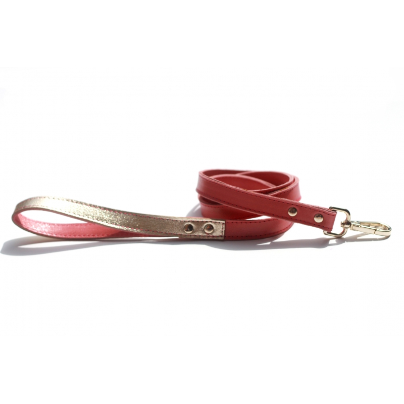 Correa para perro fabricada en piel de alta calidad, combina piel lisa color rosa con empuñadura en dorado.