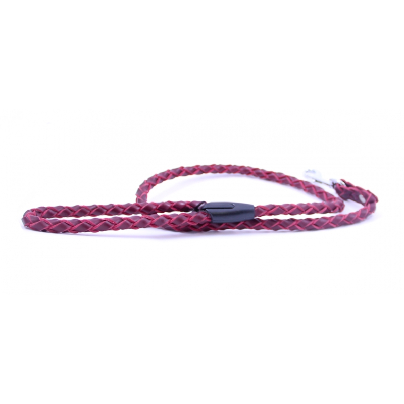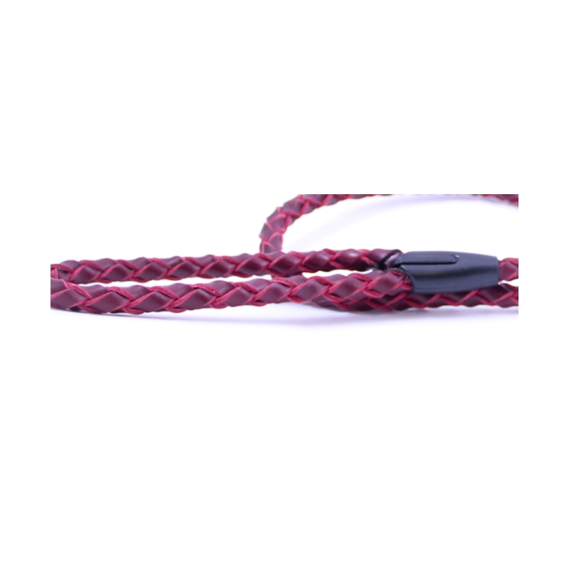 Correa trenzada para perro en color vino. Antes de su empuñadura lleva un refuerzo de plástico duro en color negro.