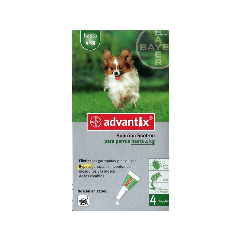 Pipetas Advantix para perro de 1,5 hasta 4 kg Advantix es un eficaz antiparasitario externo para perros con un peso inferior a 4kg. Actúa frente a los principales parásitos del perro debido a un doble efecto: insecticida y repelente. Efecto insecticida frente a:-Pulgas (adultas y larvas)-Garrapatas-Piojos Masticadores Efecto repelente frente a:-Garrapatas-Mosquitos-Flebótomos-Moscas de los establos. IMPORTANTE:Advantix puede aplicarse a partir de 1.5 kg y 7 semanas de edad. Además, también puede aplicarse durante el periodo de gestación y lactancia sin convertirse en un riesgo para los cachorros. Su aplicación debe ser mensual. NO USAR EN GATOS.Recipiente :